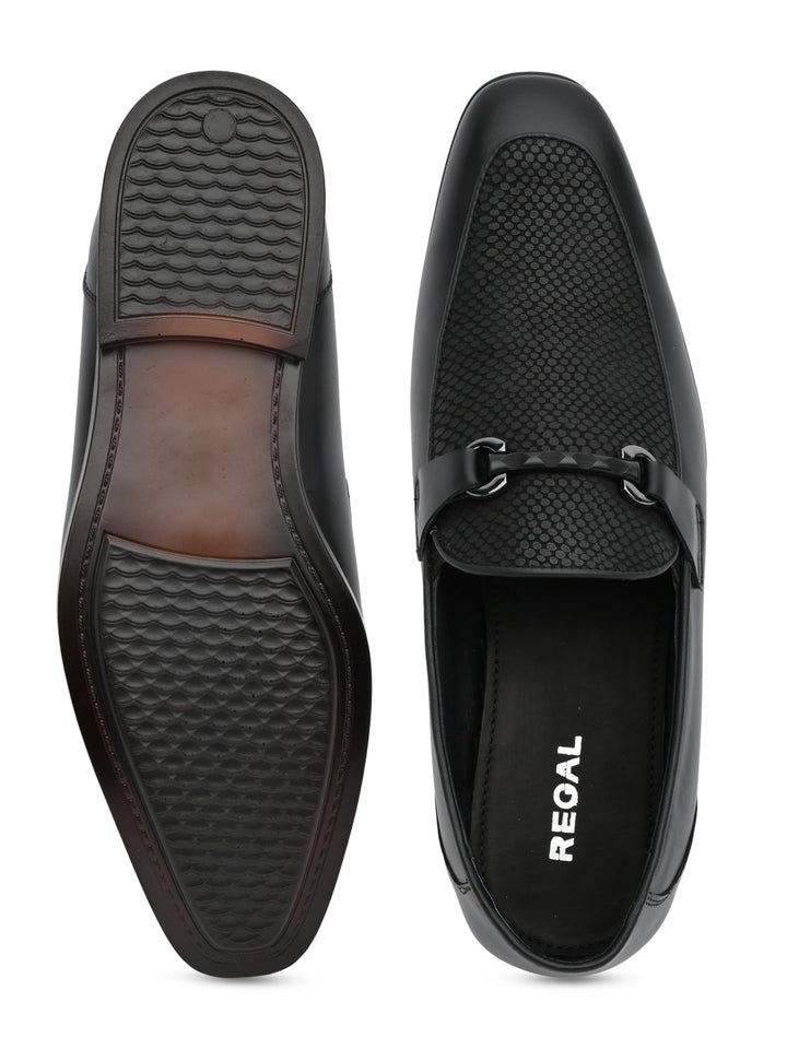These elegant men's leather slip-on shoes by Regal Shoes bring a polished finish to every formal outfit. The textured surface adds subtle character, while the statement buckle delivers a refined and confident look. Designed for smooth wear and all-evening comfort, they’re a perfect choice of men's footwear for celebrations and dressed-up moments. A standout pick when you want to make a sharp impression without the hassle of laces.