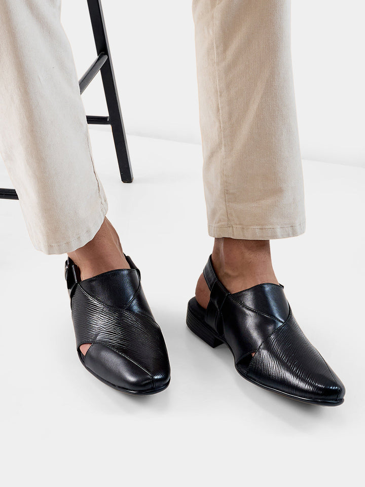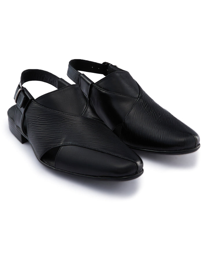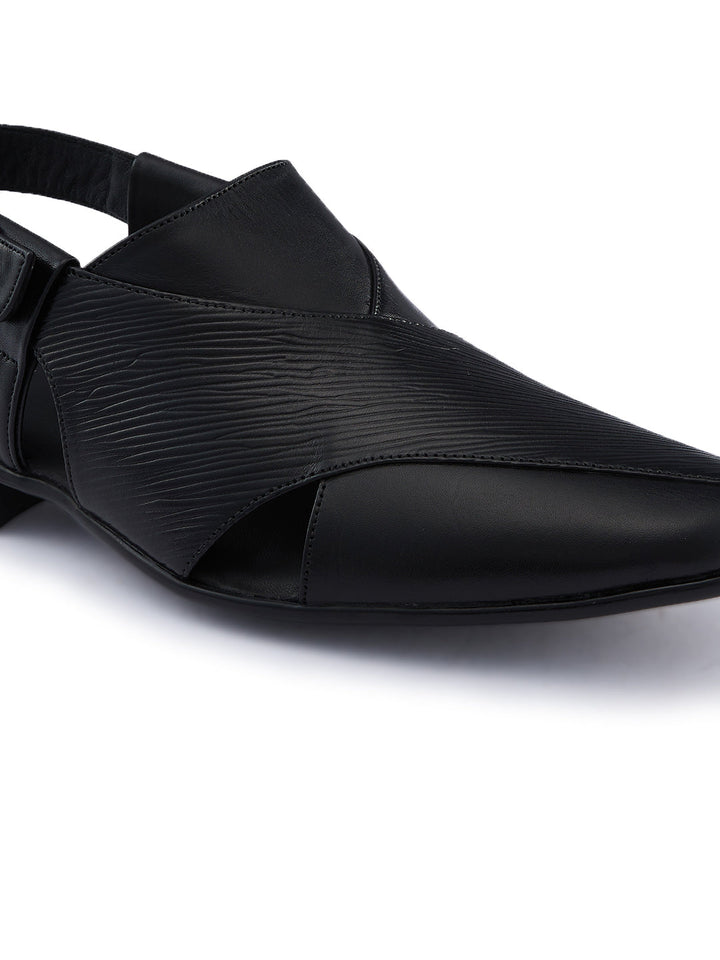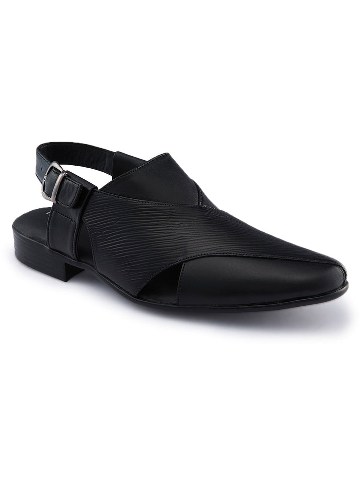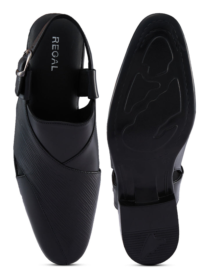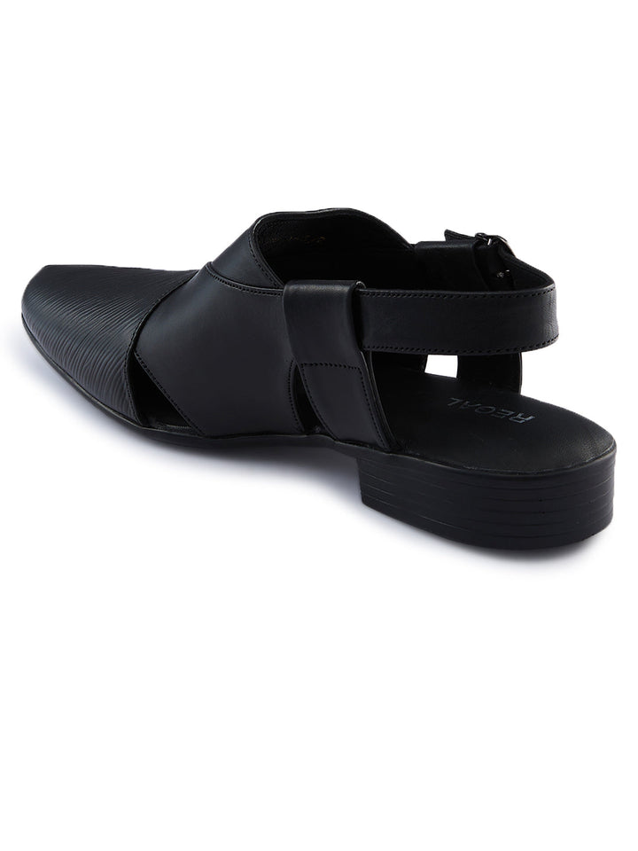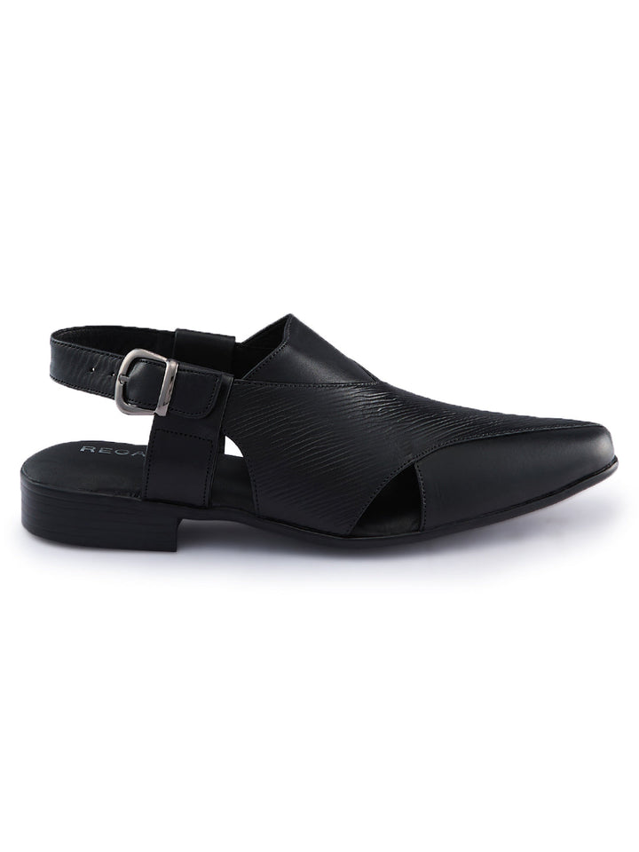 Crafted in textured leather for a bold ethnic look, these Regal Shoes leather sandals elevate traditional outfits with modern flair. A comfortable footbed ensures they feel as good as they look at celebrations and cultural events. The style is a classic traditional Indian men's footwear design that works for weddings, pujas and festive occasions.