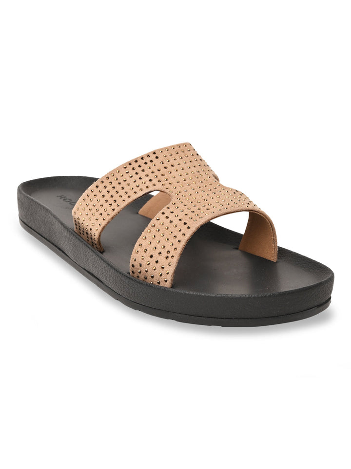 Walk in elegance with Rocia by Regal Women Studded H Flats. Made with synthetic materials and TPR sole, these flat sandals offer subtle studded detailing, slip-on convenience, and an open round toe for casual summer styling.