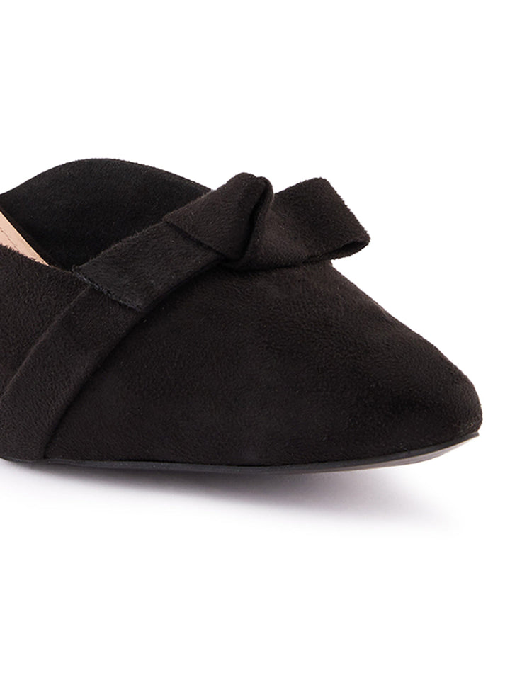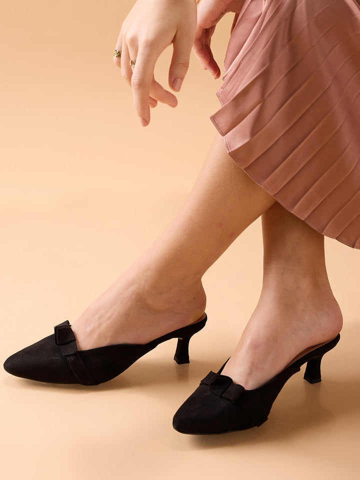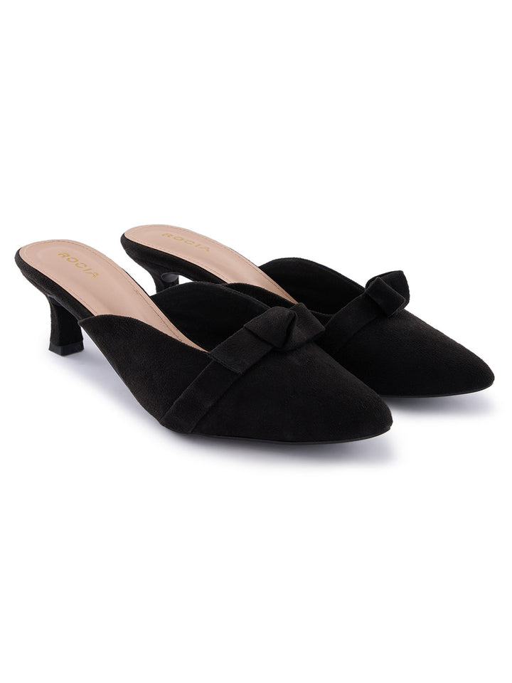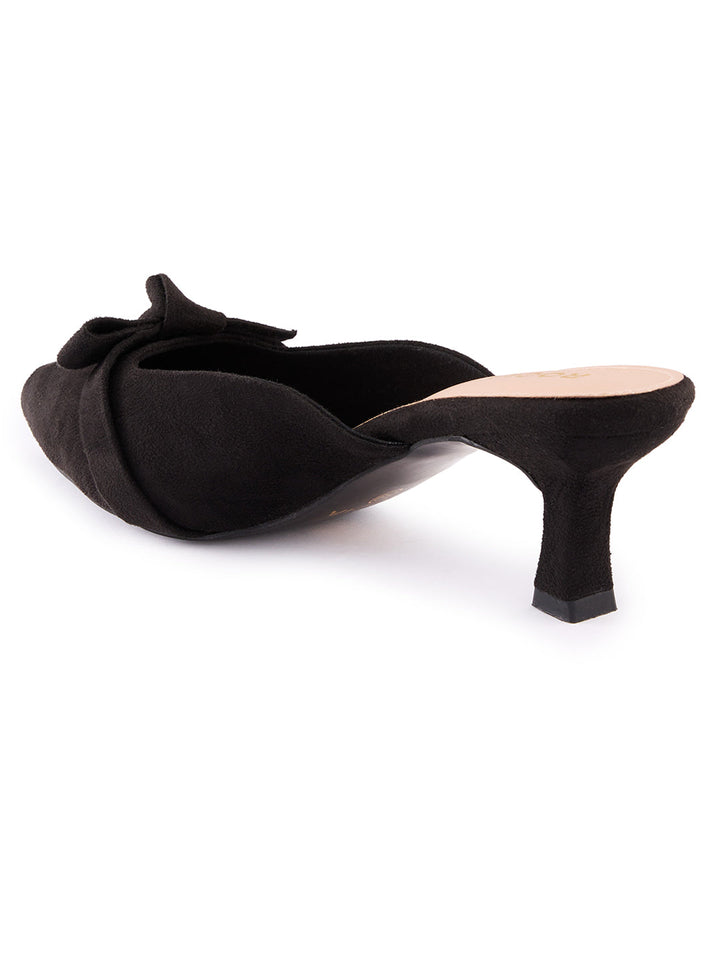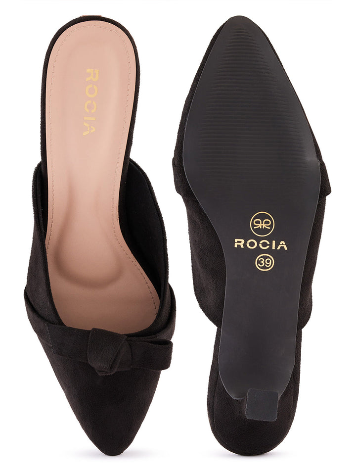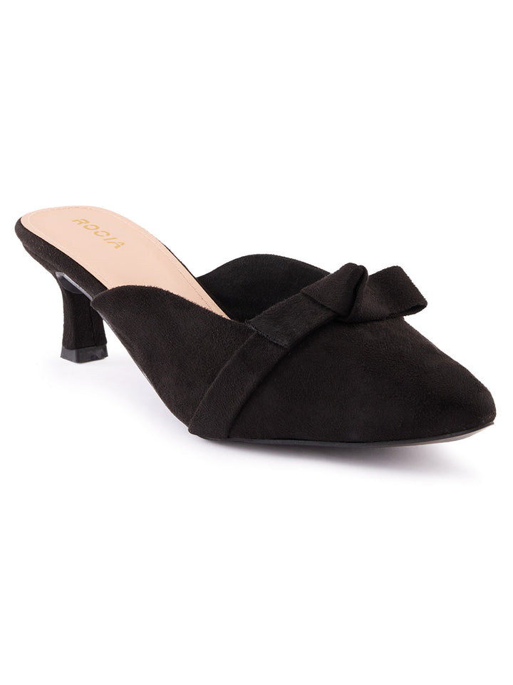 Make a classic statement with Rocia by Regal Black Women Bow-tie Mule Pumps. These 2-inch synthetic kitten heels have TPR soles, slip-on style, pointed toes, and a cute bow-tie detail for casual summer wear.