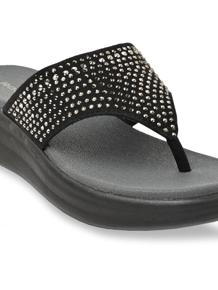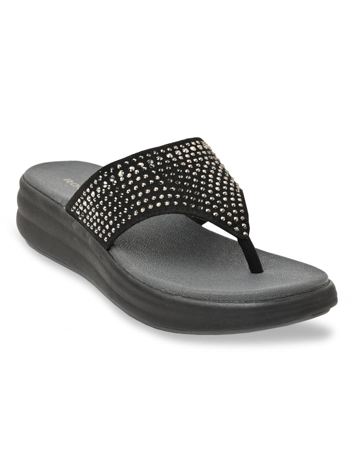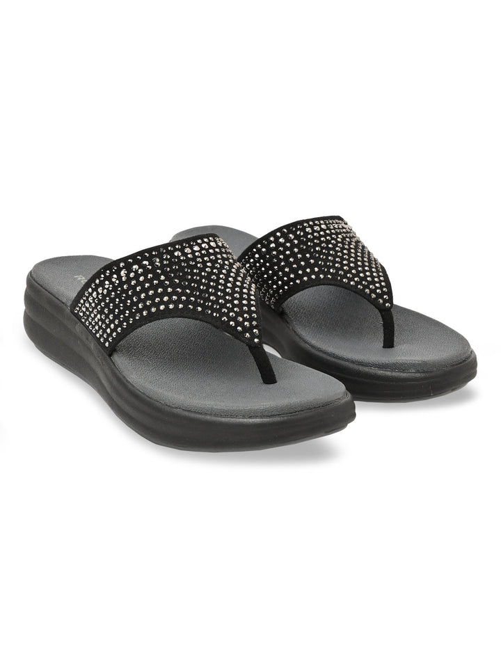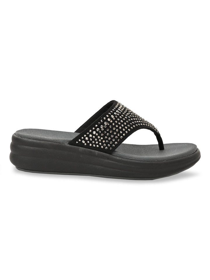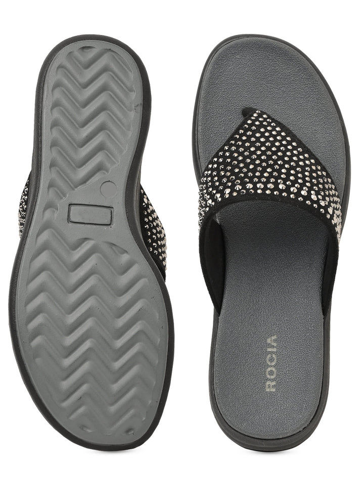 Sparkle with Rocia by Regal Diamante Studded Comfort Wedges in Beige and Black. These 2-inch synthetic wedge heels offer PU soles, slip-on style with open round toes, perfect for casual summer sophistication.