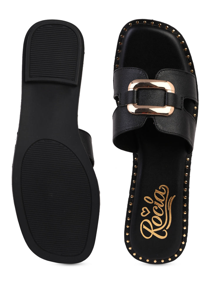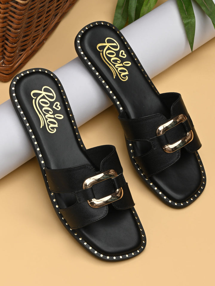 Step out in confidence with Women Stylish Flats from Rocia by Regal, crafted with durable synthetic material and cushioned PU sole. The strapless open-toe design gives them a sleek, modern vibe, while the flat heel keeps them light and comfortable for daily use. Perfect for casual wear and summer looks, these flats are a timeless addition to your wardrobe.