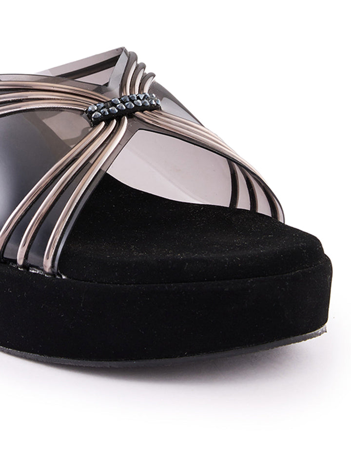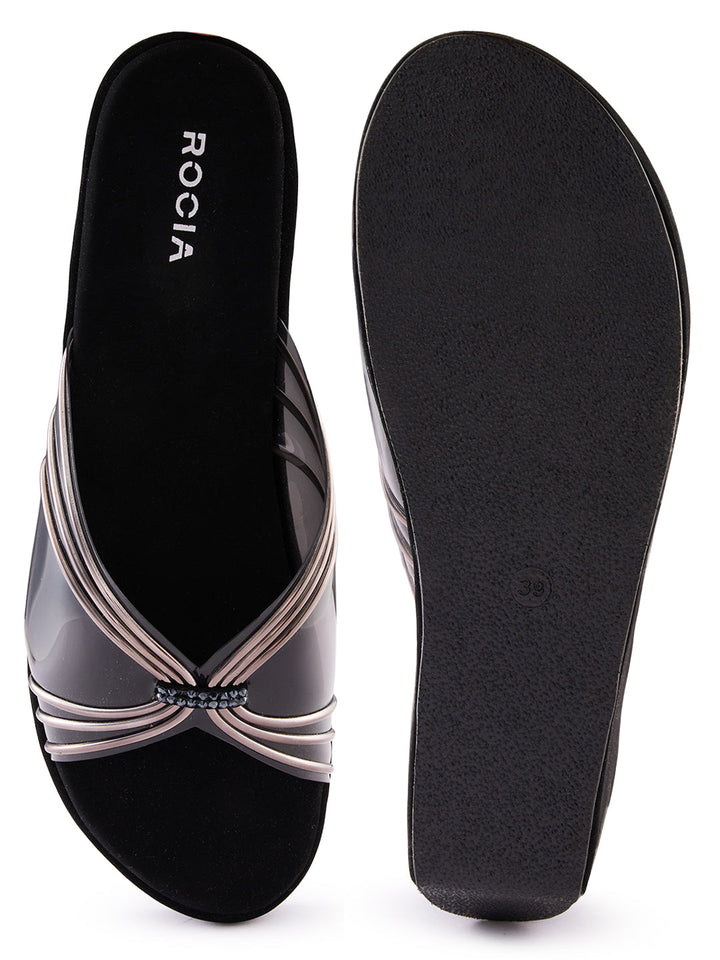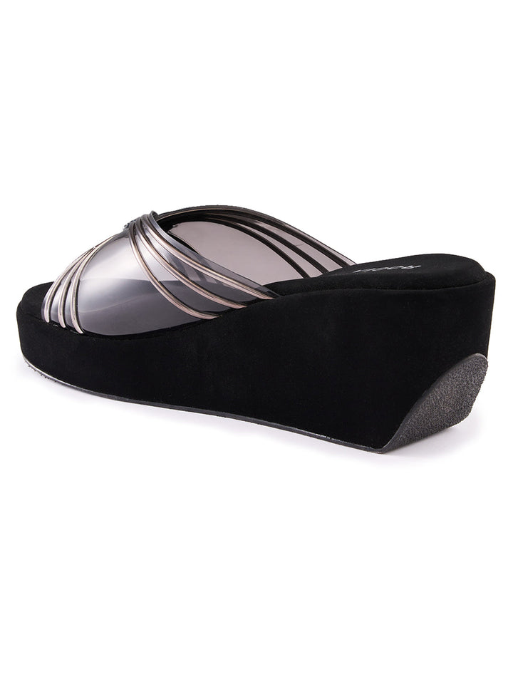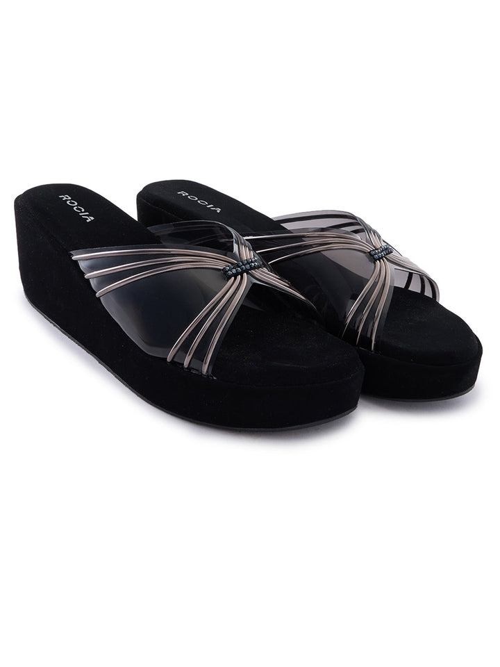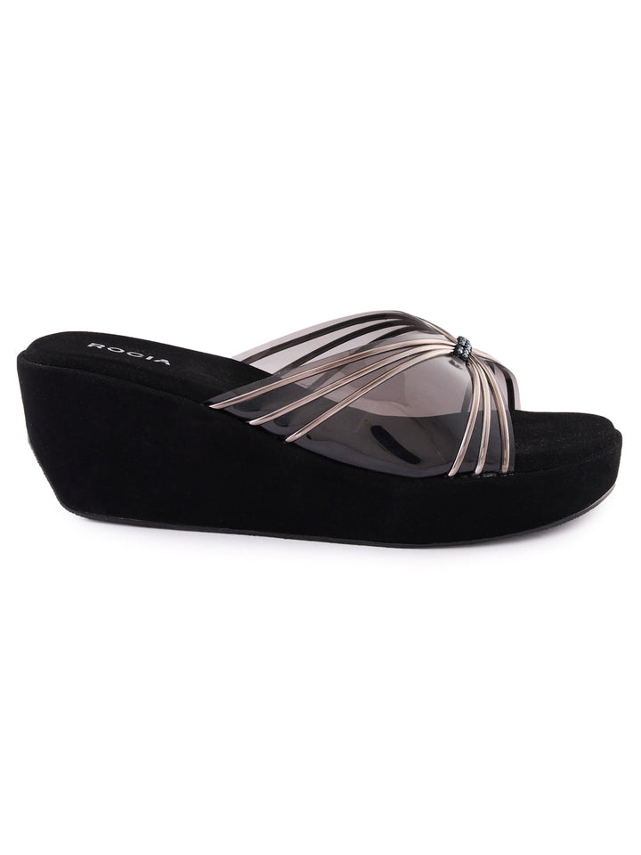 Make a trendy statement with Rocia by Regal Women Vinyl Platforms in Black and Rose Gold. These 3-inch synthetic platform heels come with TPR soles, open round toes, and a sleek slip-on design ideal for casual summer wear.