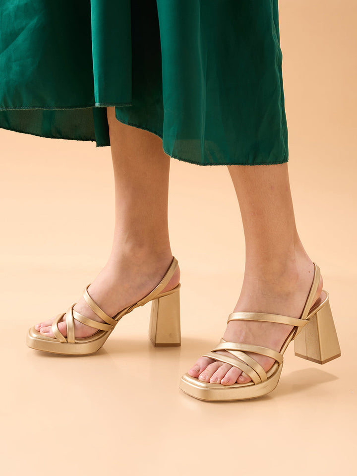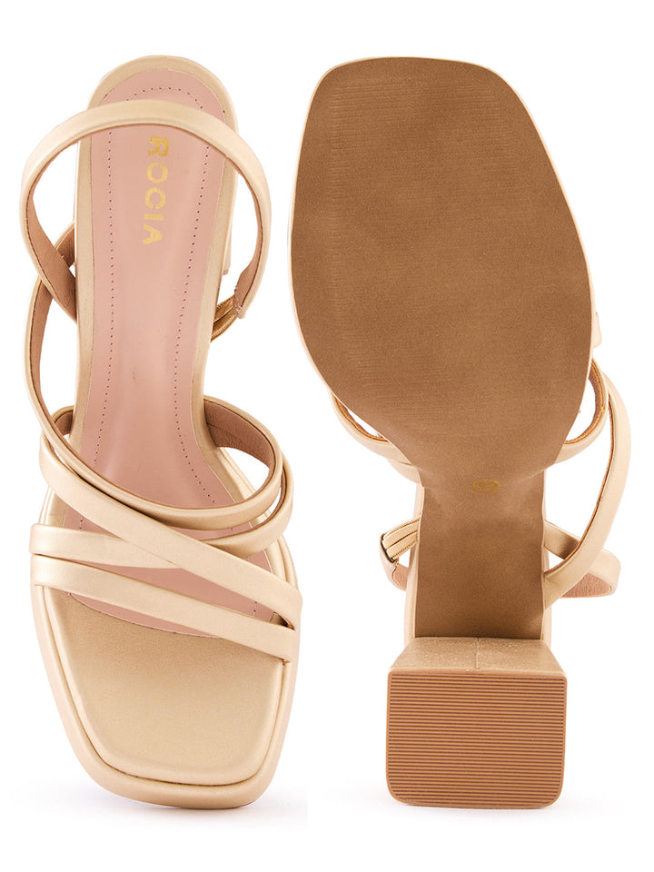 Channel chic summer vibes with Rocia by Regal Strappy High Block Heel Sandals in Black and Gold. These 3.5-inch synthetic block heels feature rubber soles and sling back closures with square open toes, designed for casual summer elegance.