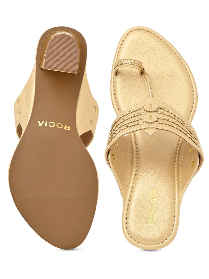 Experience classic charm with Rocia by Regal Women Stylish Block Heel Kolhapuris. These 2-inch synthetic block heels come with PU soles, slingbacks, and pull-on closure featuring an open round toe, ideal for casual summer wear.