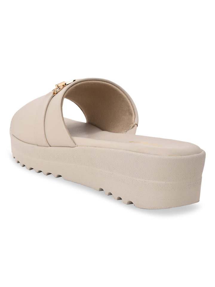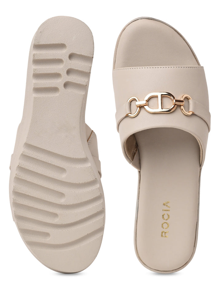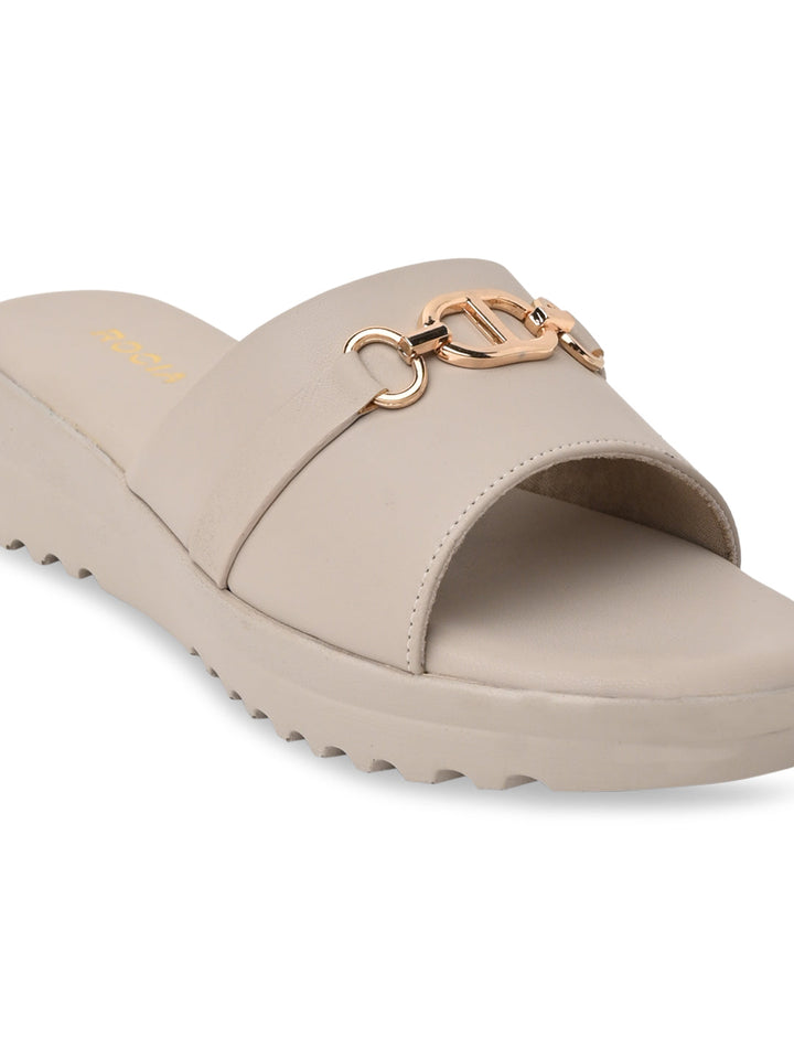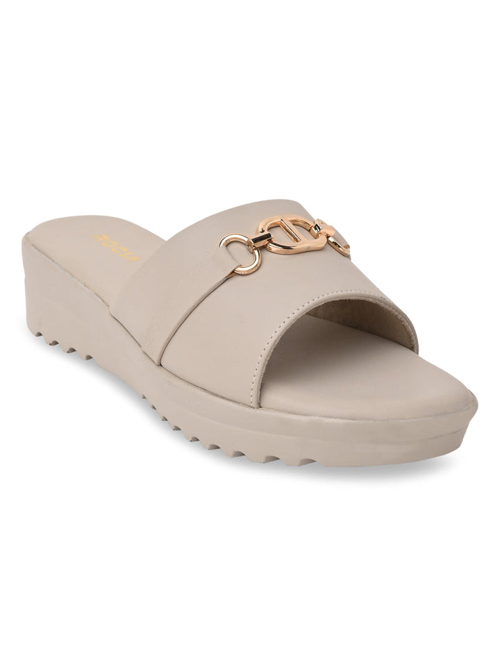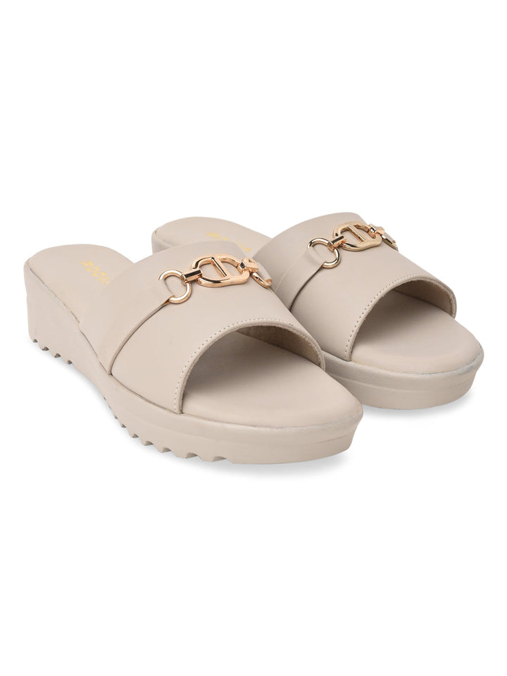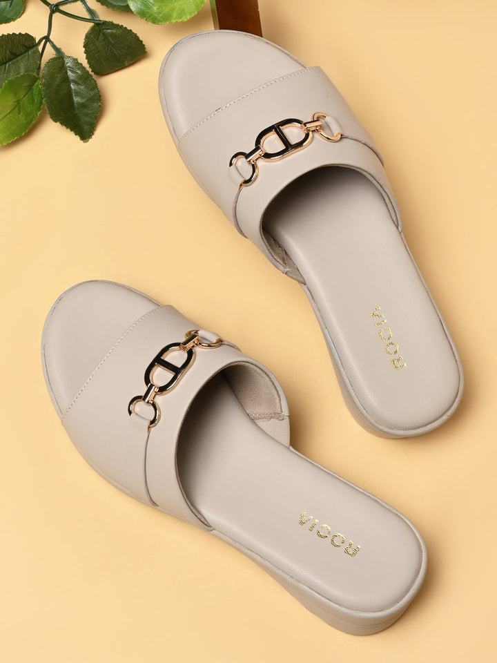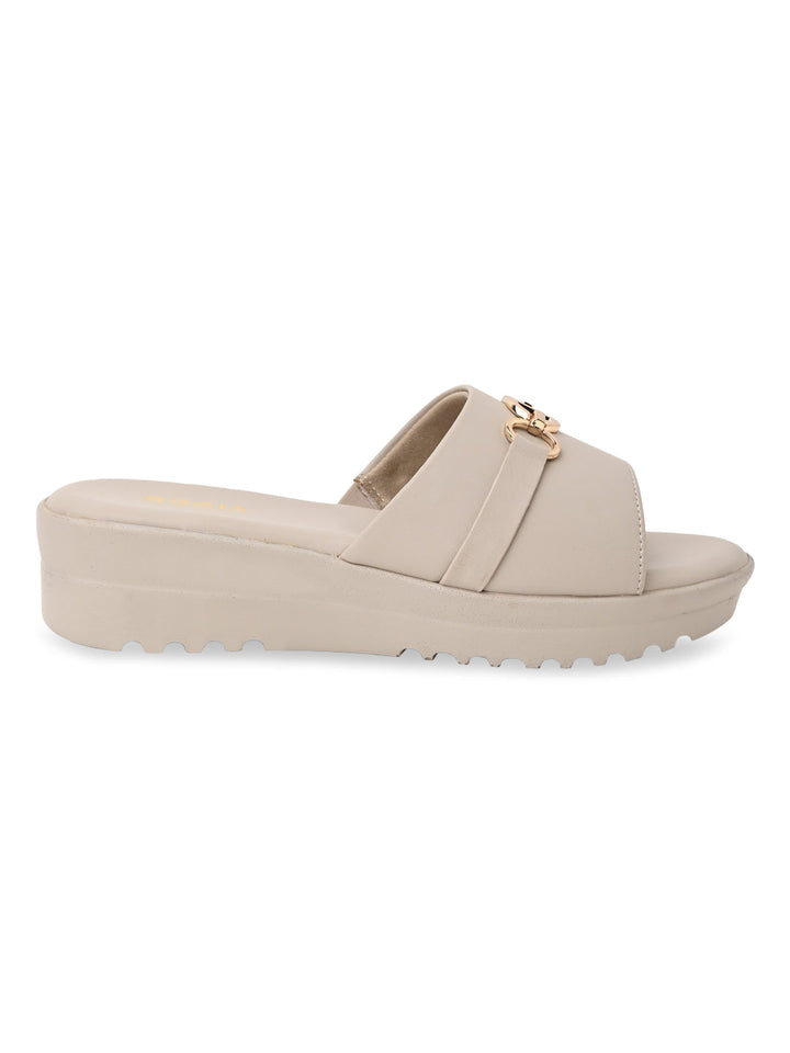 Step into classic comfort with Rocia by Regal Grey and Nude Women Buckled Classic Slip On Wedges. Synthetic uppers, PU soles, 2-inch wedge heels, and slip-on design with open round toes make them ideal for casual summer wear.