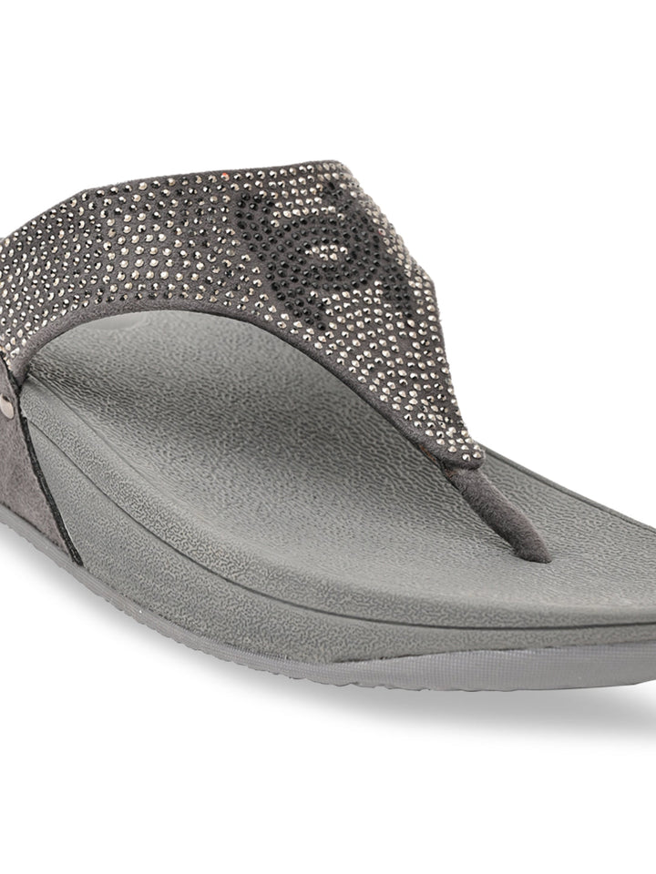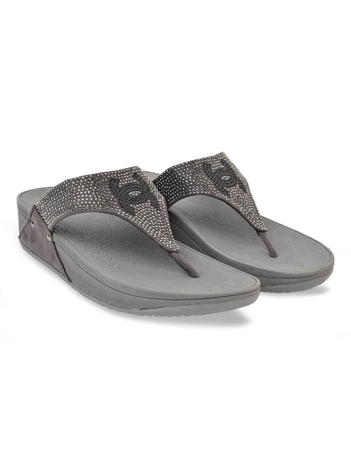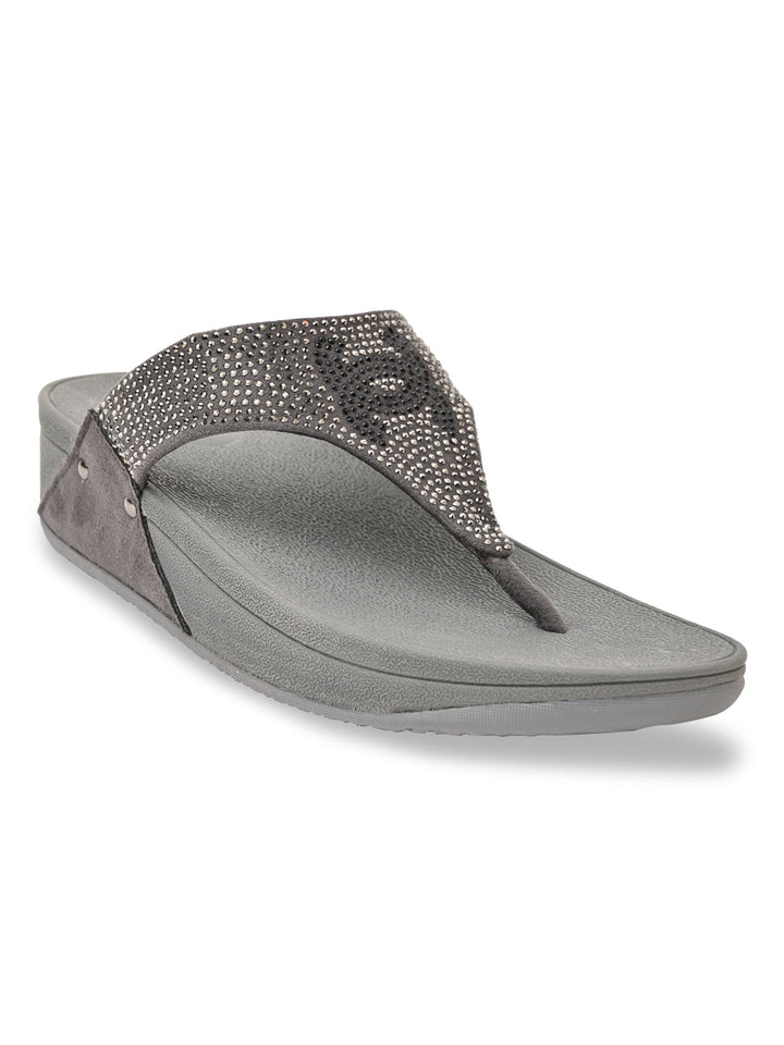 Shine all day in Rocia by Regal Grey Women Diamond Studded Comfort Wedges. These 2-inch synthetic wedge heels have TPR soles, slip-on closure, open round toes, and T-strap detailing, suited for casual summer elegance.