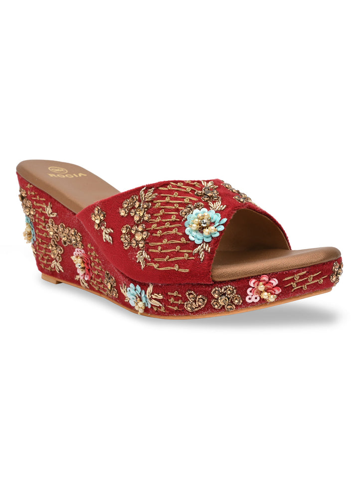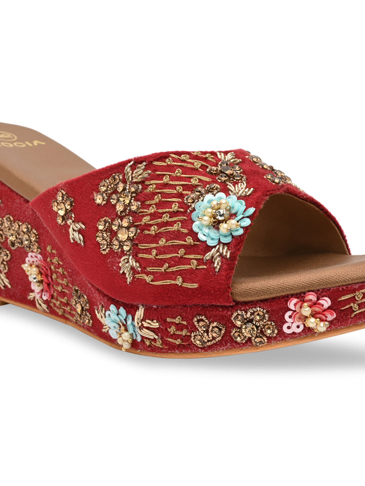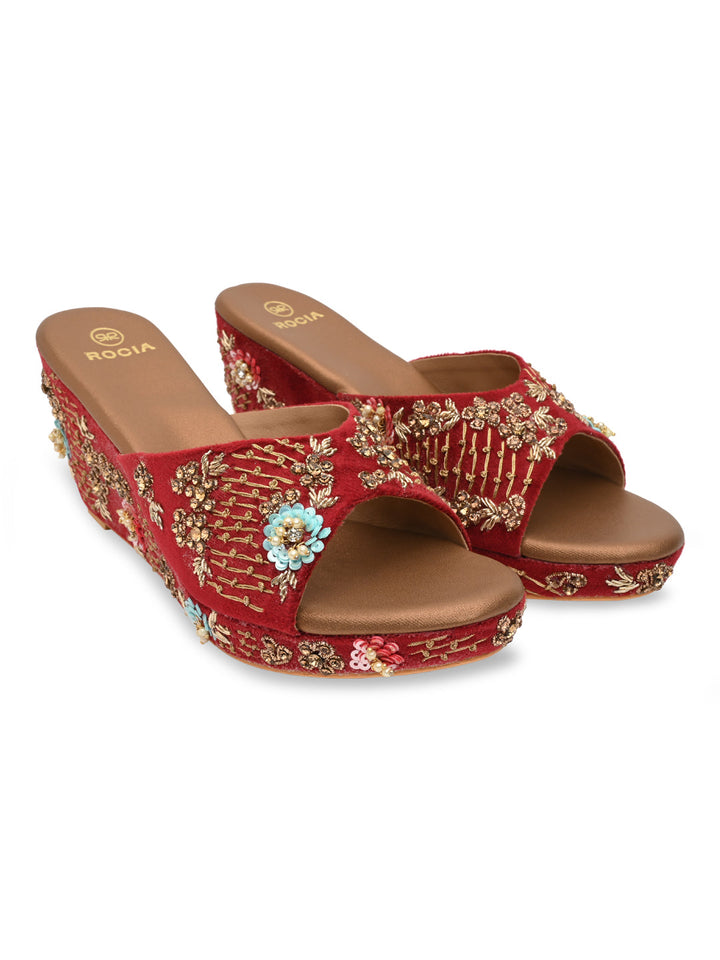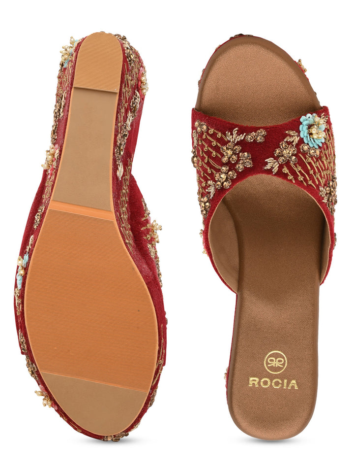 Step into luxury with these heavy embroidered velvet platforms crafted for special occasions. The rich fabric and intricate embroidery create a regal appeal. Soft cushioning adds comfort for hours of elegance. Perfect for weddings, festivals, and grand celebrations.