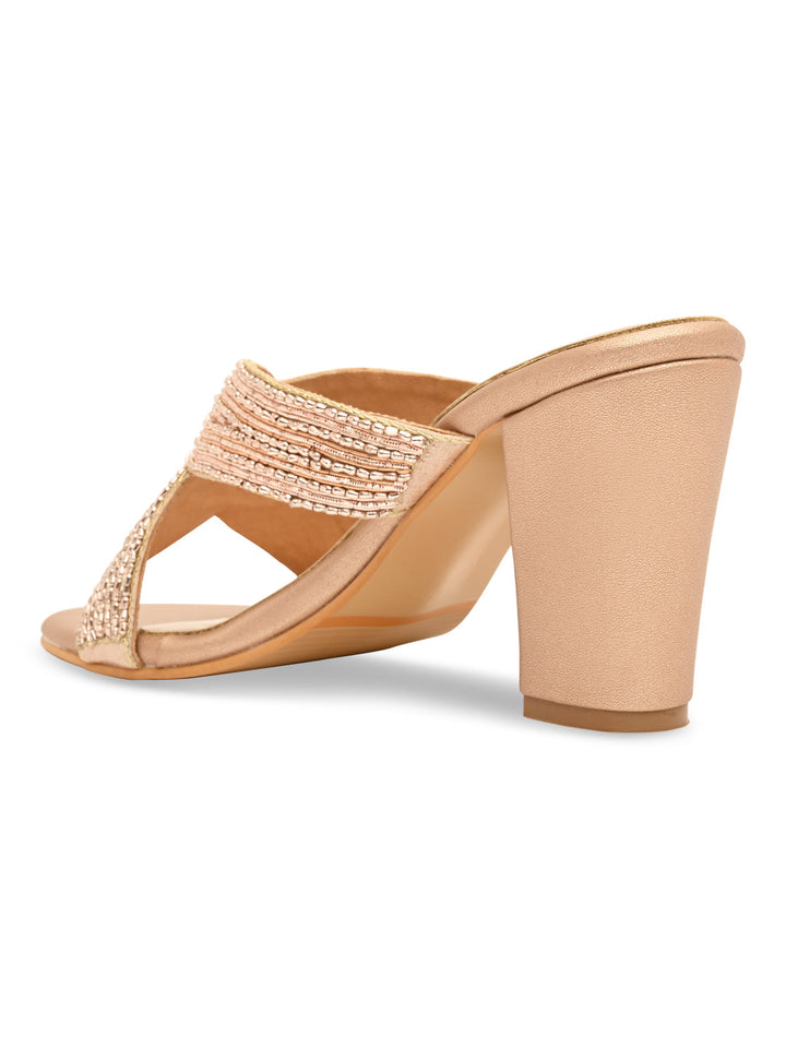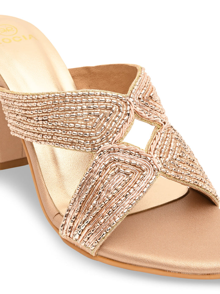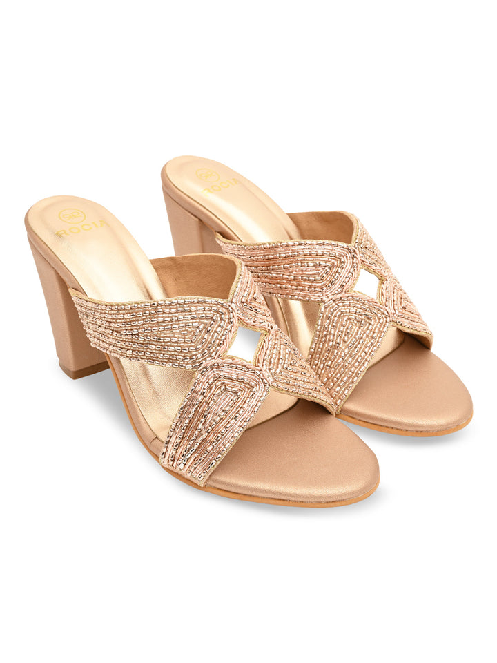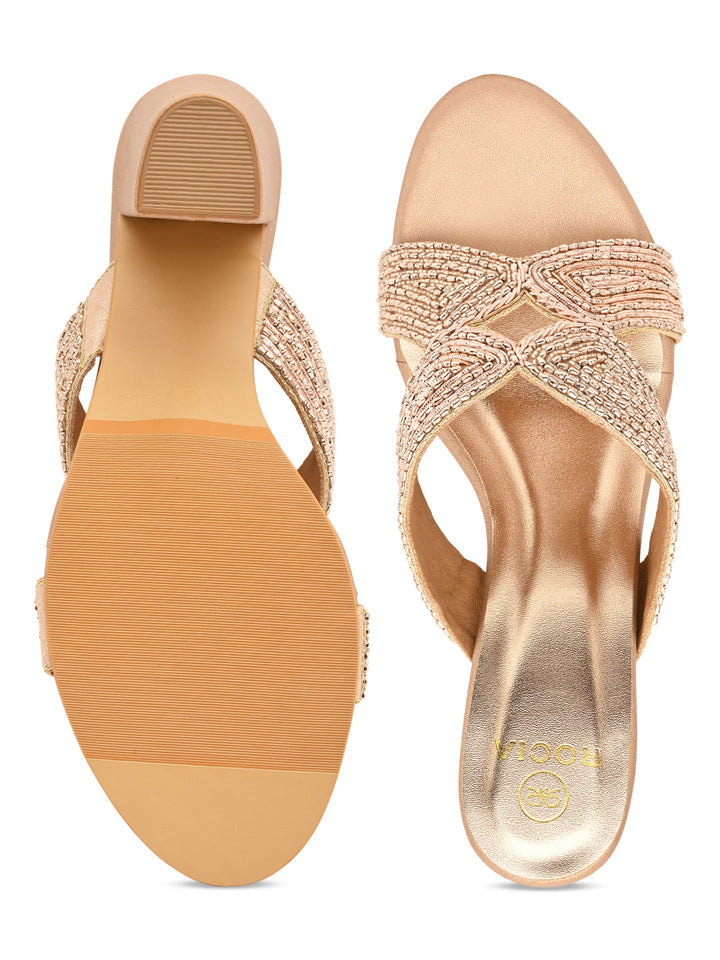 Step into grandeur with these heavily embroidered block heels that radiate elegance. Their intricate patterns and vibrant texture make them a showstopper at any event. The supportive heel adds comfort for hours of wear. Pair them with traditional ensembles for a luxurious finish.