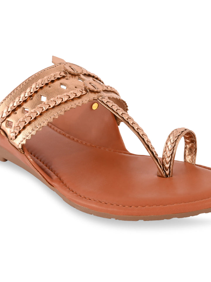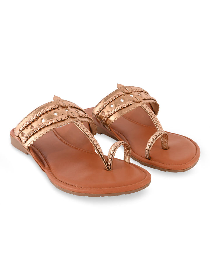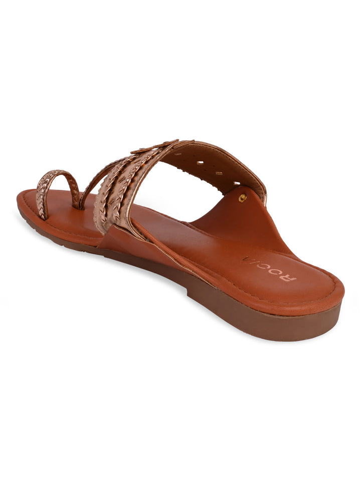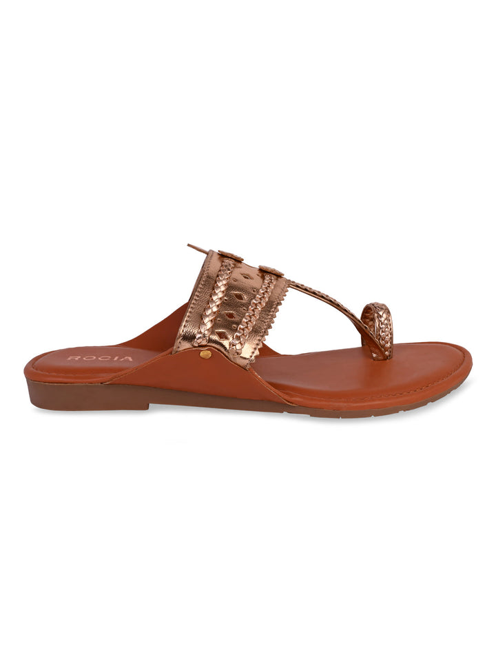 Shine in style with Women Metallic Flat Kolhapuris from Rocia by Regal, designed with a sleek synthetic upper and durable TPR sole. Featuring a strapless, open-toe silhouette with a metallic finish, these flats bring a modern twist to the traditional Kolhapuri look. Perfect for casual wear, summer outings, or festive gatherings, their flat heel ensures all-day comfort with effortless charm.