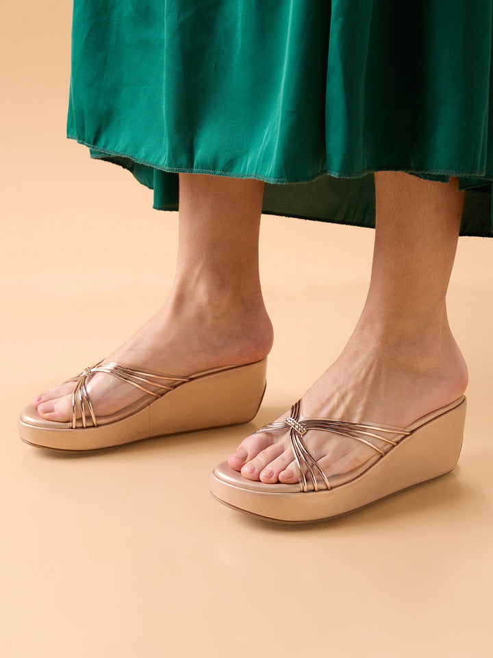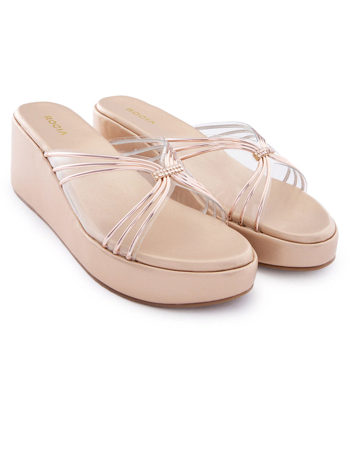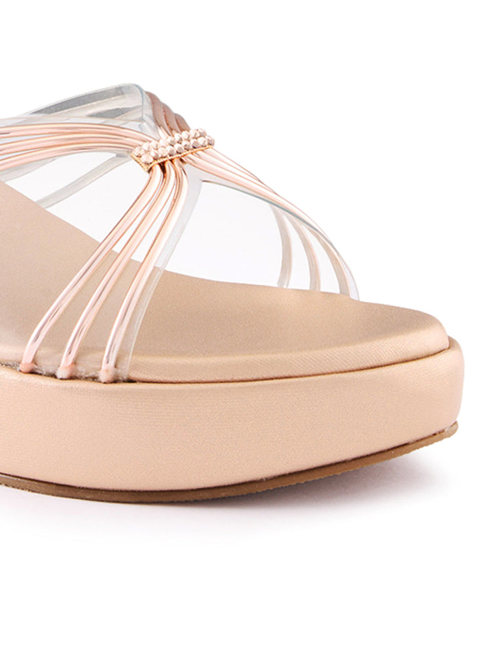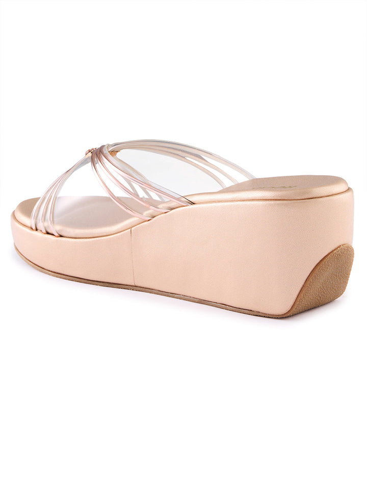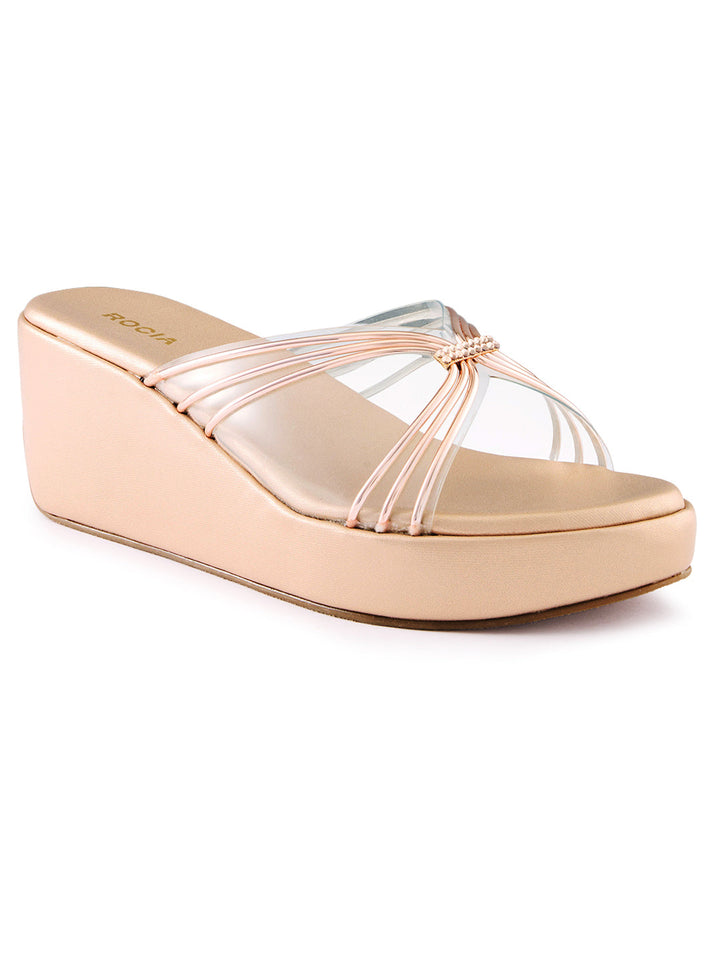 Make a trendy statement with Rocia by Regal Women Vinyl Platforms in Black and Rose Gold. These 3-inch synthetic platform heels come with TPR soles, open round toes, and a sleek slip-on design ideal for casual summer wear.