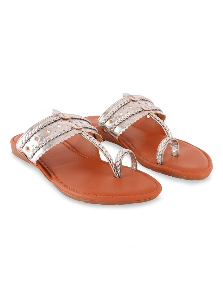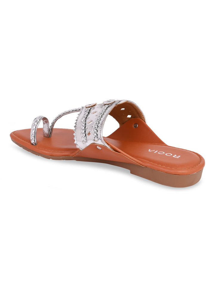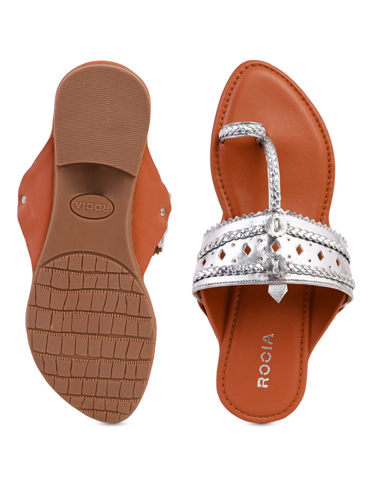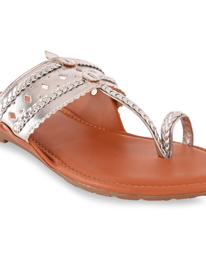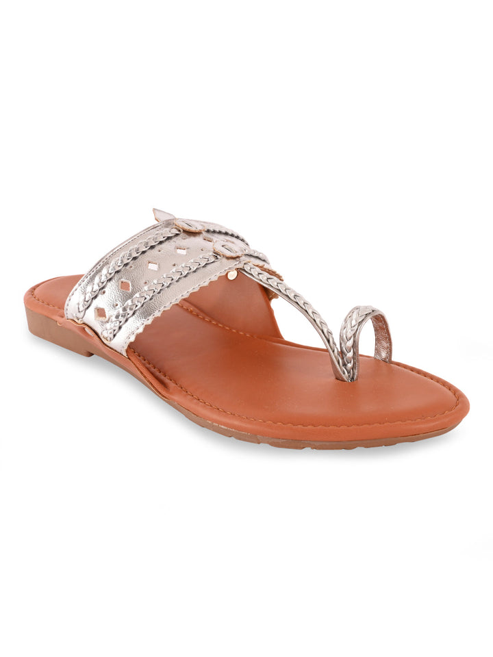 Shine in style with Women Metallic Flat Kolhapuris from Rocia by Regal, designed with a sleek synthetic upper and durable TPR sole. Featuring a strapless, open-toe silhouette with a metallic finish, these flats bring a modern twist to the traditional Kolhapuri look. Perfect for casual wear, summer outings, or festive gatherings, their flat heel ensures all-day comfort with effortless charm.