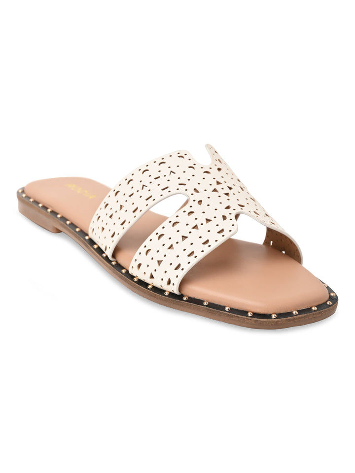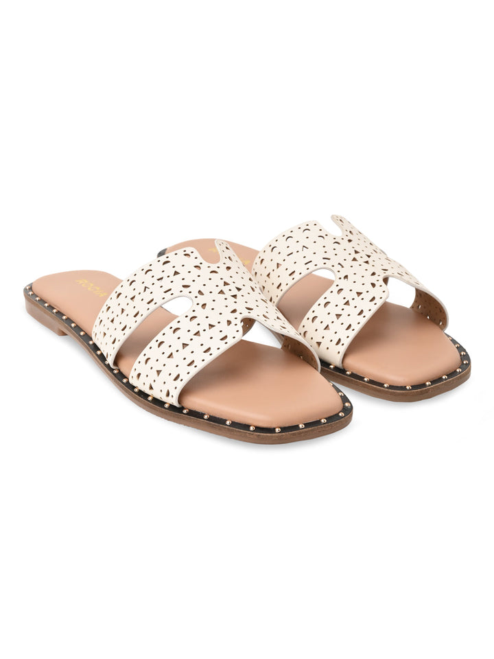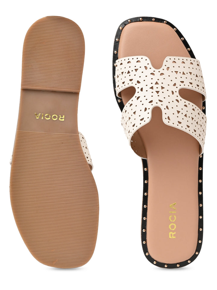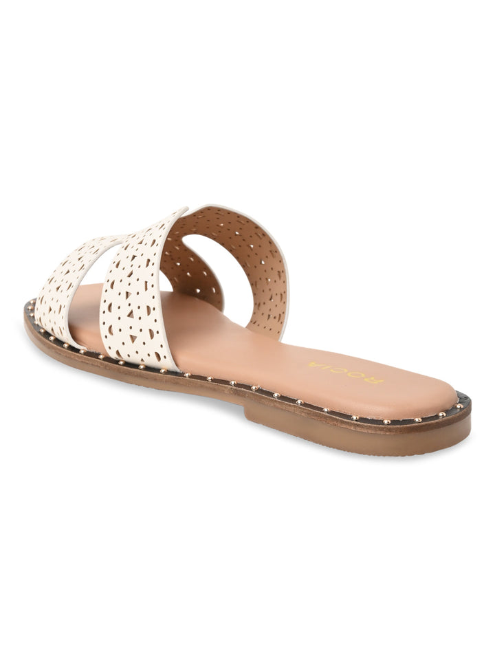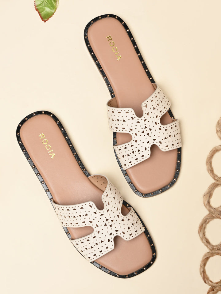 Embrace intricate style with Rocia by Regal Laser Cut H Flats. These synthetic flats have a 1-inch flat heel, slip-on design, and delicate laser cut detailing, ideal for casual summer wear.