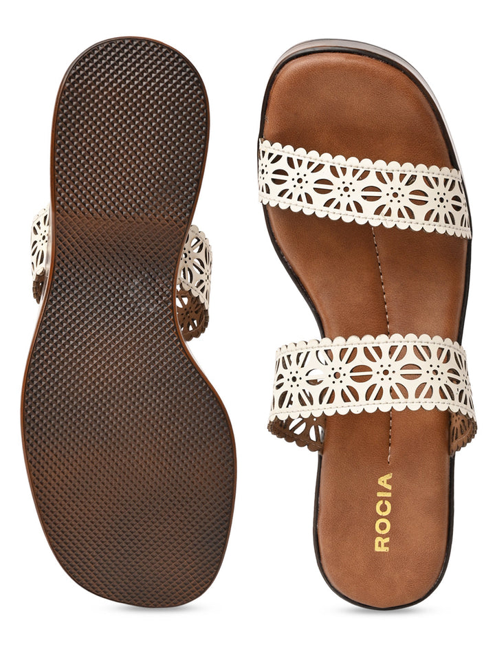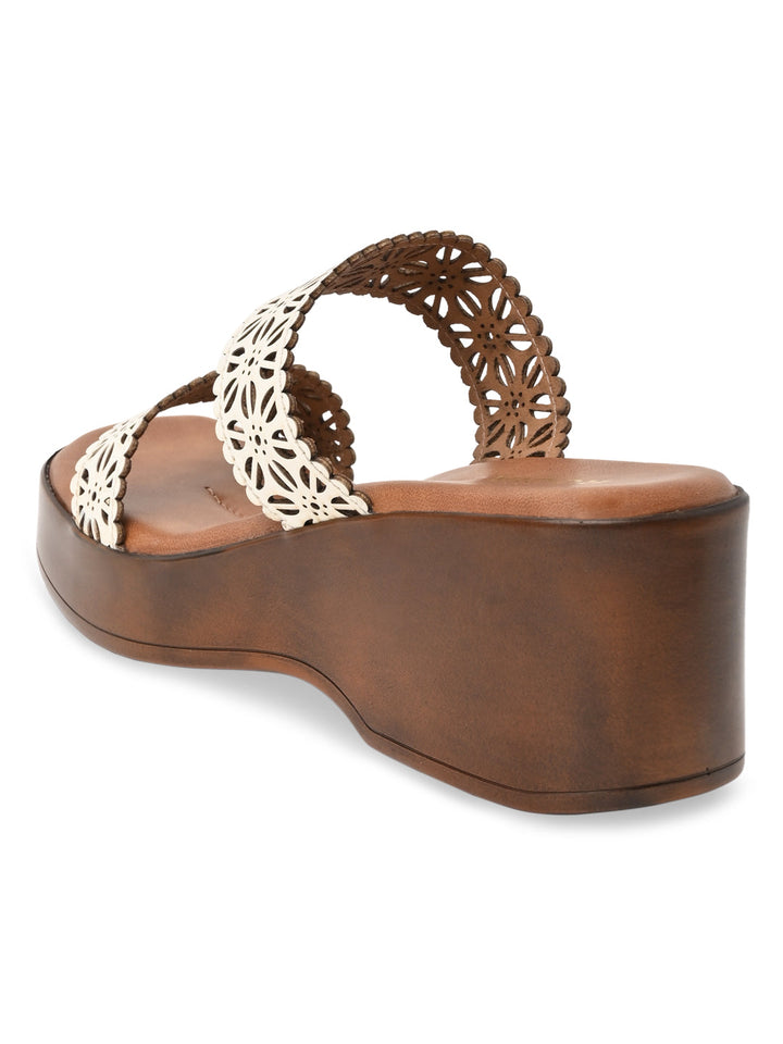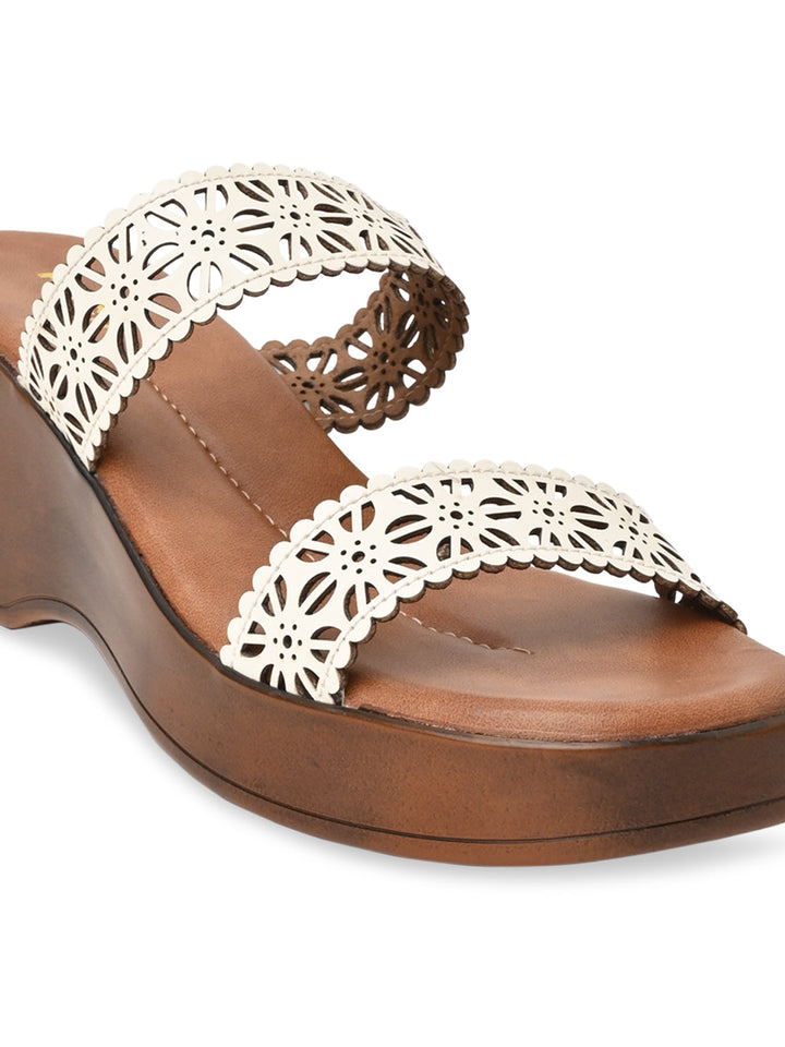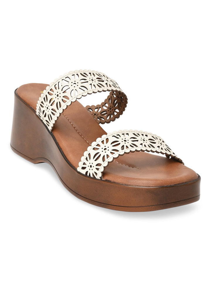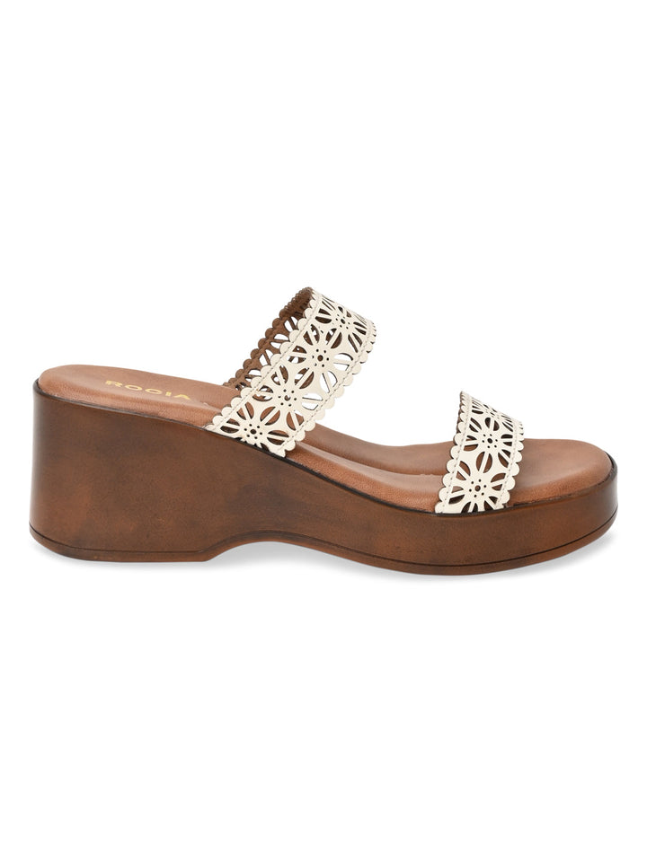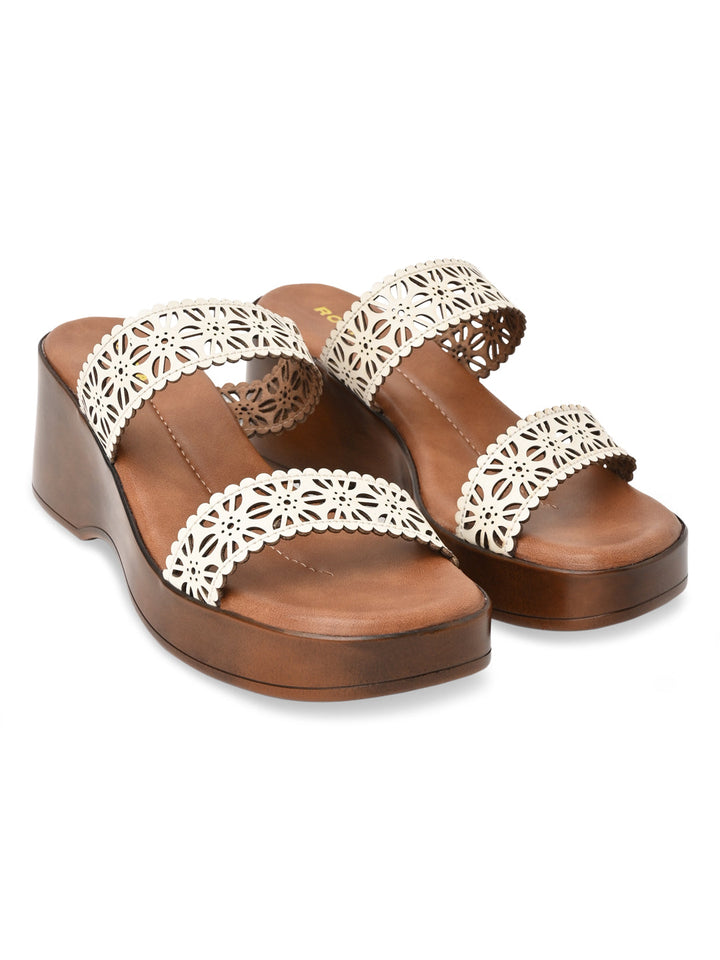 Refined elegance meets summer style with Rocia by Regal Women Laser Cut Platforms in Beige and White. These 3-inch synthetic platform heels feature PU soles, slip-on closure, open round toes, and delicate laser-cut details.